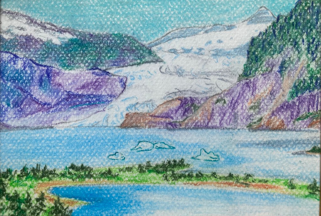 Pastel drawing of the Mendenhall Glacier from Panorama Point. Drawing by Catalina Burch.